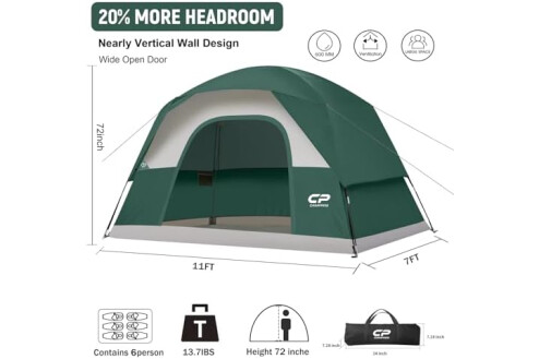 Spacious 6 Person Tent with 72" Center Height: Our near-vertical wall design creates generous headroom, allowing most adults to stand comfortably. At 11'x7' with 72" center height, this camping tent provides ample space for 6 campers with gear