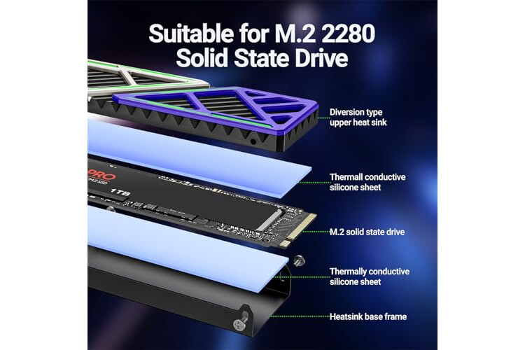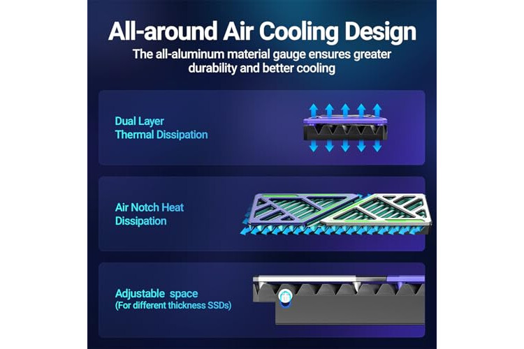 Equipped with soft thermal pads to fill the gap of the heatsink and SSD chips to improve thermal conductivity. Adjustable screw fixing holes on the base frame to achieve the better contact to enhance ...