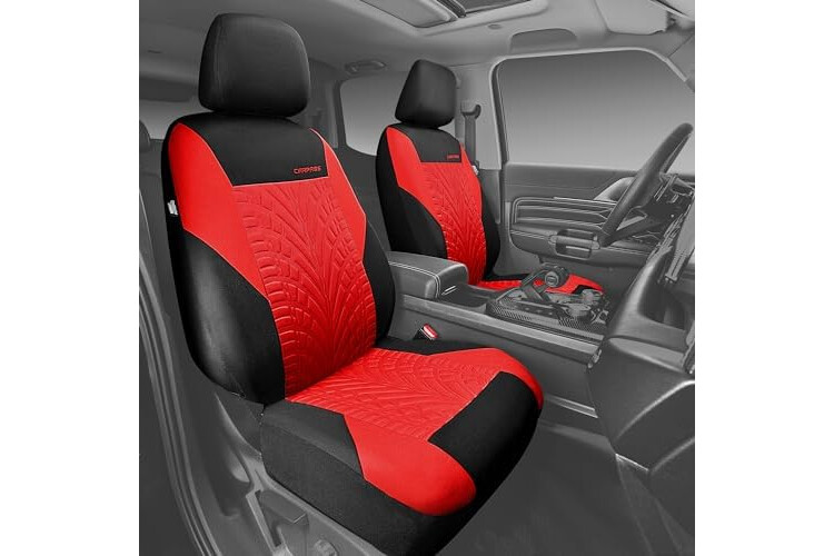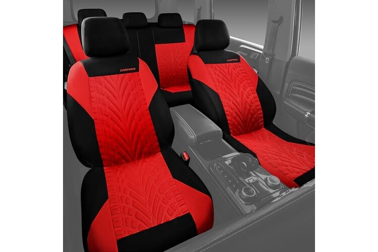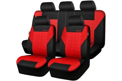 CAR PASS Car Seat Covers Full Sets, Front & Split Rear Bench for Car, 3D Tyre Embossed Automotive Interior Covers, Airbag Compatible, Quick Setup Universal Fit Seat Covers for Car, SUV(Black Red)