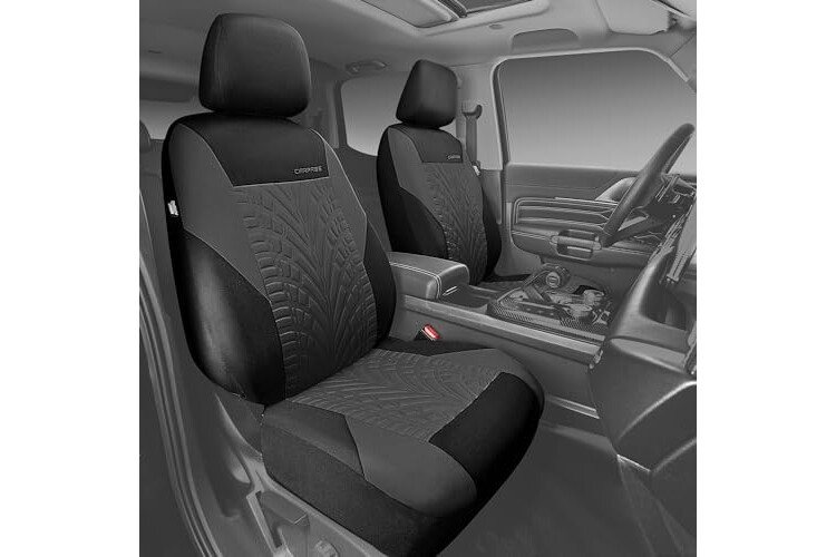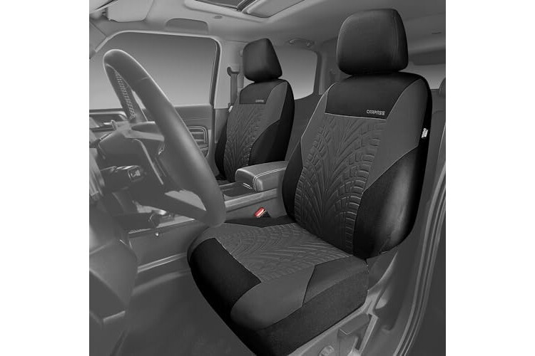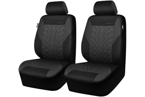 CAR PASS Emboss Tyre Front Seat Covers, Universal Fit Elastic Breath Premium Cloth seat Covers Front Seats only for Truck SUV Sedan, Airbag Compatible, Charcoal on Black