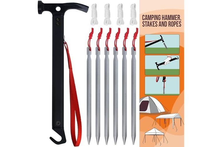 Eurmax USA Hiking Camping Tent Stakes and Hammer Set Lightweight Multi-Function Tent Hammer with Tent Stake Remover,Tent Pegs for Camping, Hiking, Backpacking, Gardening(Silver Stakes)