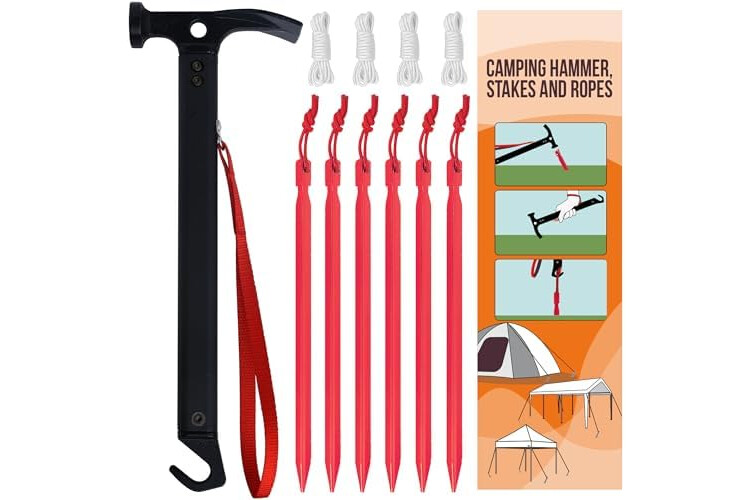 Eurmax USA Hiking Camping Tent Stakes and Hammer Set Lightweight Multi-Function Tent Hammer with Tent Stake Remover,Tent Pegs for Camping, Hiking, Backpacking, Gardening(Red Stakes)