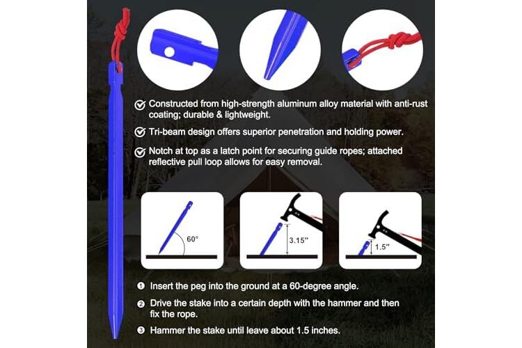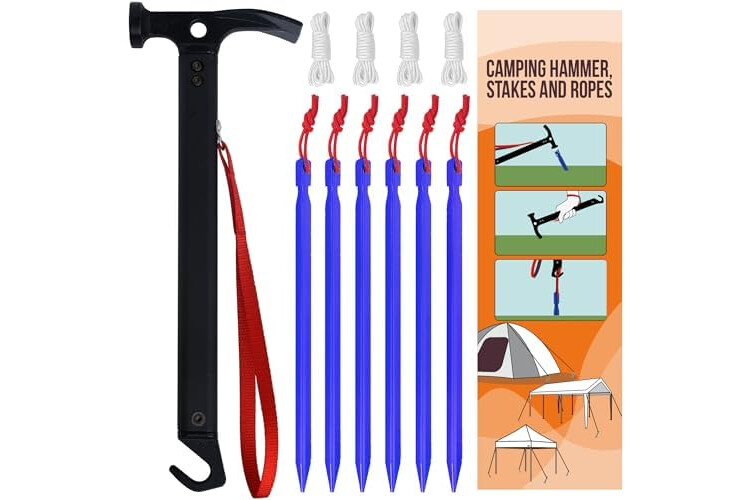 Eurmax USA Hiking Camping Tent Stakes and Hammer Set Lightweight Multi-Function Tent Hammer with Tent Stake Remover,Tent Pegs for Camping, Hiking, Backpacking, Gardening(Blue Stakes)