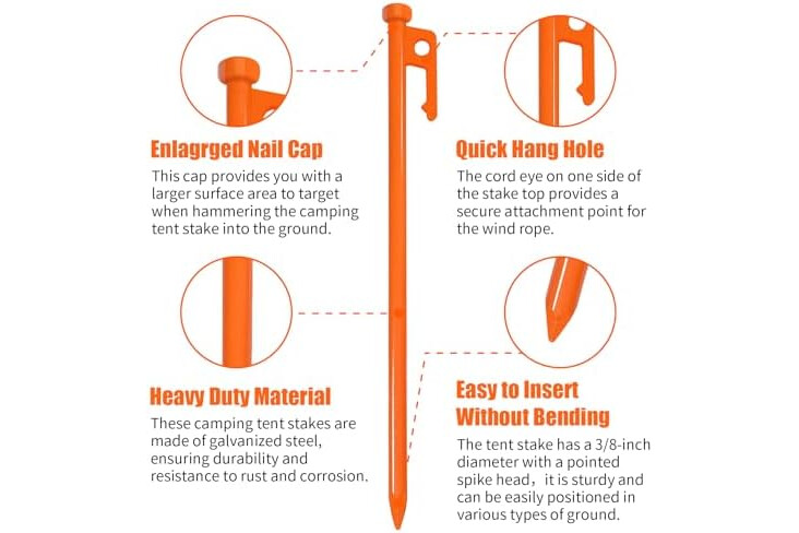 Easy Tips for better use: - Please do not nail the tent stake vertically to the ground. - Make the tent stake and the ground into a 60-degree angle. - Please leave...