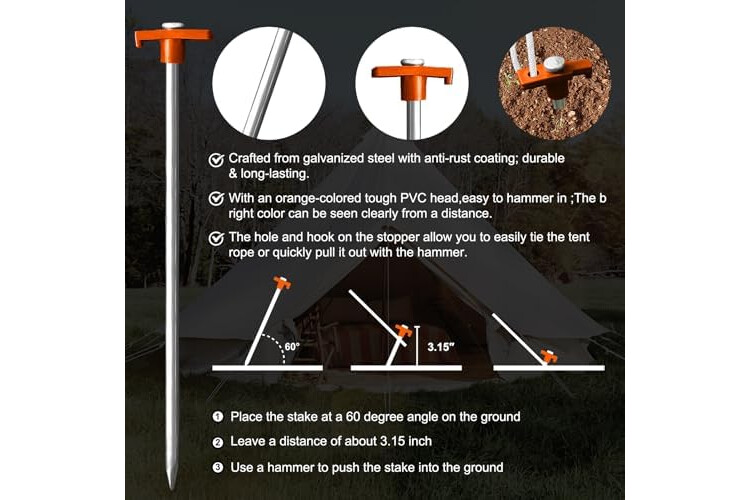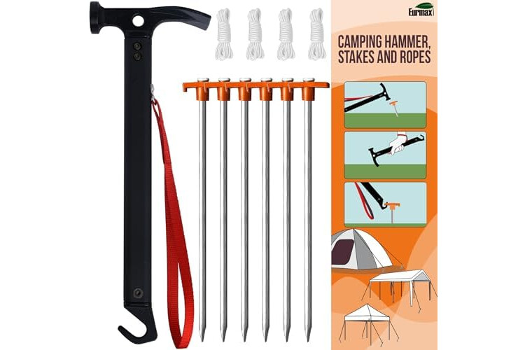 Eurmax USA Hiking Camping Tent Stakes and Hammer Set Lightweight Multi-Function Tent Hammer with Tent Stake Remover,Tent Pegs for Camping, Hiking, Backpacking, Gardening(Orange Stopper Stakes)