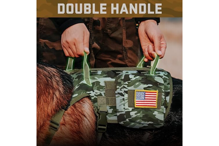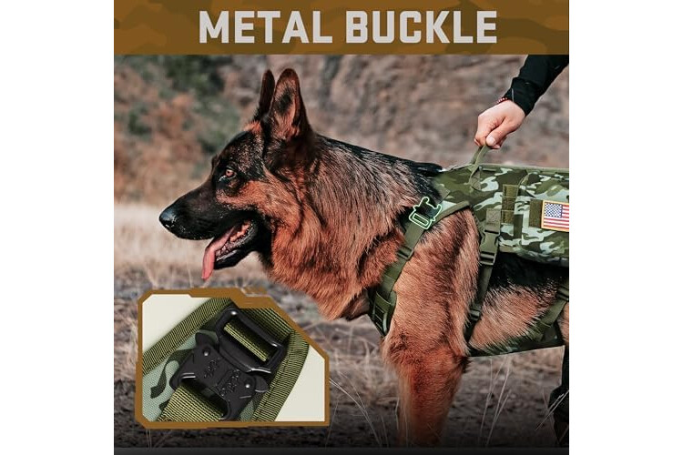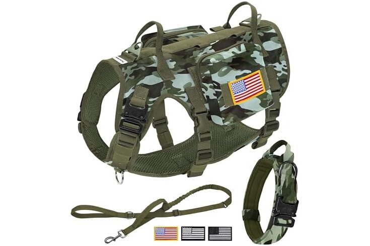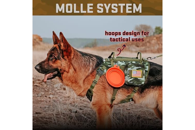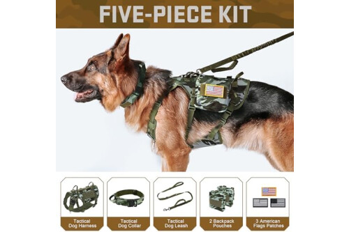 All-in-One Tactical Bundle for Active Dogs: 1 military-grade dog harness,2 MOLLE backpacks,1 tactical collar,1 shock-absorbing bungee leash and 3 hook and loop patches.Perfect for hiking,training or urban adventures--store treats,gears in the pouches