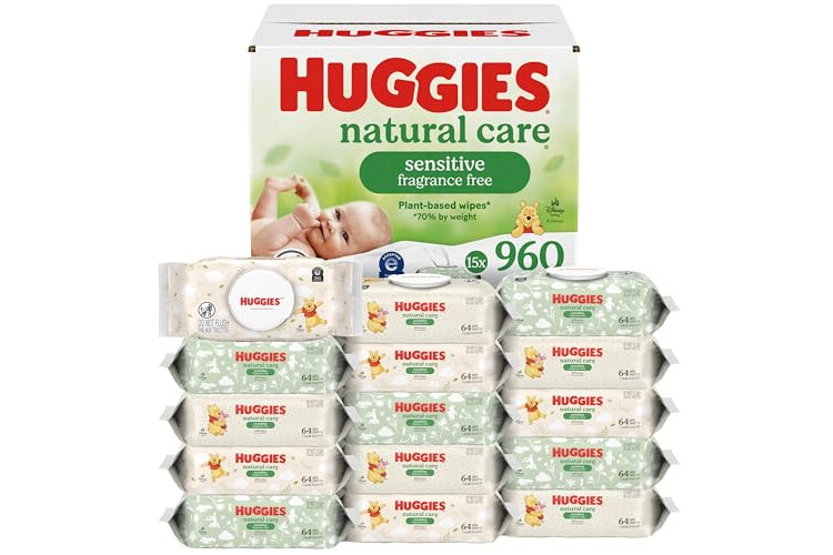 • 15 flip-top packs of 64 Huggies Natural Care Sensitive Baby Wipes, Unscented (960 wipes total), packaging may vary