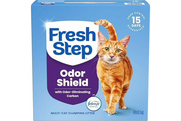 Fight litter box odors in your multi-cat home with Fresh Step Multi-Cat Clumping Litter. Featuring an extra-strength formula, this Fresh Step clumping cat litter delivers even more odor-fighting protection with the power of Febreze to leave behind a fresh, clean scent. Made with natural clay plus built in odor defense, this clumping clay litter uses activated charcoal and Ammonia Block technology to guarantee 15 days of odor control in your multi-cat litter box (1). Featuring ClumpLock technology, the Fresh Step litter multi cat formula locks in liquid and cat urine odor on contact to form tight clumps. This makes scooping your kitty litter box quick and effortless, and it helps prevent crumbles from being left behind. In addition to easy cat litter clumping, the scented cat litter has a low-dust formula to help keep surfaces cleaner in your home. Enjoy more catnaps and cuddle time with your kitty when you choose Fresh Step cat litter. (1) See package for more information on terms and conditions