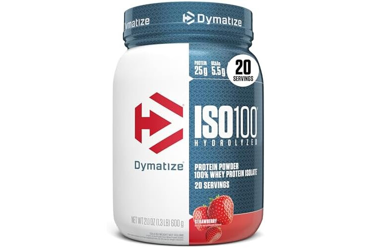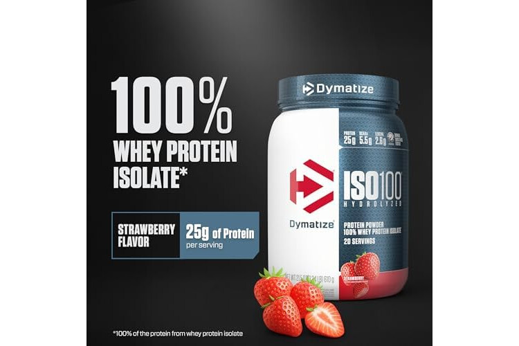 Dymatize ISO100 Whey Protein Powder Isolate, Strawberry, 25g of Protein, 5.5g BCAAs, Less Than 120 Cal., Gluten Free, 1g Fat, 1g Sugar, 2g Carb (20 Servings)