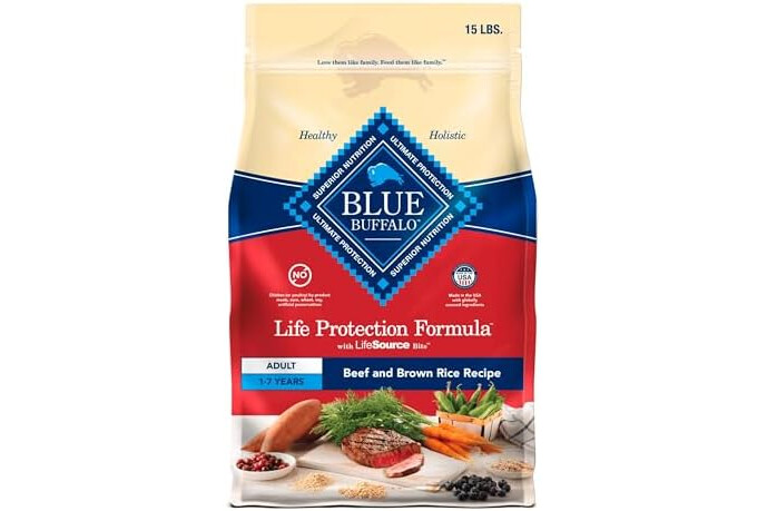 Formulated for the health and well-being of adult dogs, BLUE Life Protection Formula Beef and Brown Rice dry dog food is made with the finest natural ingredients enhanced with vitamins, minerals, and other nutrients. It’s a high-quality, balanced recipe you can both feel great about. Designed to help your dog thrive, this formula starts with real beef and contains no chicken (or poultry) by-product meals, no corn, wheat, or soy, and no artificial flavors or preservatives. Like all BLUE dry foods, BLUE Life Protection Formula includes exclusive, antioxidant-rich LifeSource Bits to support a healthy immune system in your adult dog. Give your dog the balanced nutrition of BLUE Life Protection Formula today. BLUE Life Protection Formula is brought to you by Blue Buffalo, the leader in natural pet food. Blue Buffalo makes premium-quality pet foods featuring real meat, fruit, and vegetables. Love them like family. Feed them like family.