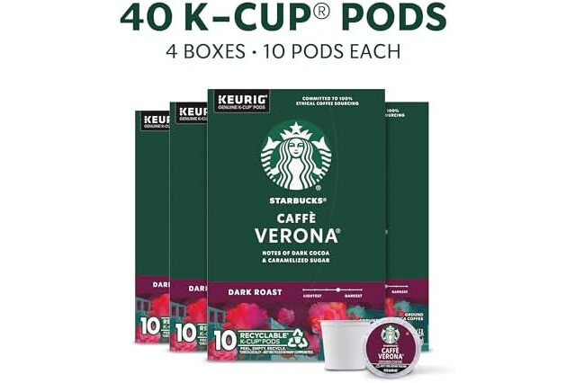 PREMIUM COFFEE IN A K-CUP POD: Enjoy the Starbucks coffee you love at home with four boxes of 10 Starbucks Caffè Verona Dark Roast K-Cup pods, designed for Keurig coffee makers—40 pods total