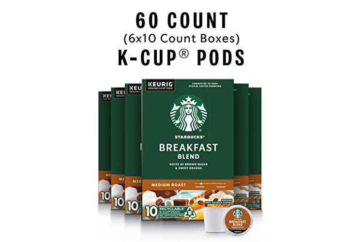 PREMIUM COFFEE IN A K-CUP POD: Enjoy the Starbucks coffee you love at home with six boxes of 10 Starbucks Breakfast Blend Medium Roast K-Cup pods, designed for Keurig coffee makers—60 pods total