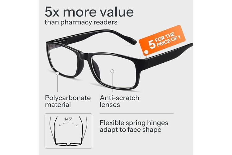 ANTI BLUE LIGHT GLASSES: Upgrade your screen time with this stylish 5-pack of blue light reading glasses men. With these eye glasses for every place you relax, you can protect your eyes and maintain a polished look wherever you go.