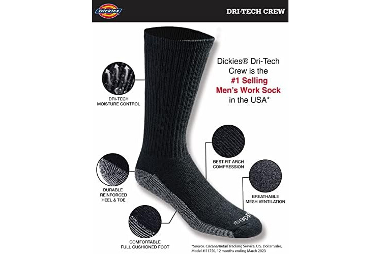 Dickies Men's Dri-Tech Original Moisture Control Crew Socks, Available in M-XXL (6, 12, 18 Pairs)