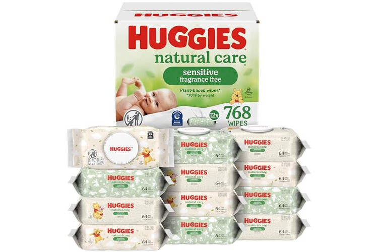 • 12 flip-top packs of 64 Huggies Natural Care Sensitive Baby Wipes, Unscented (768 wipes total), packaging may vary