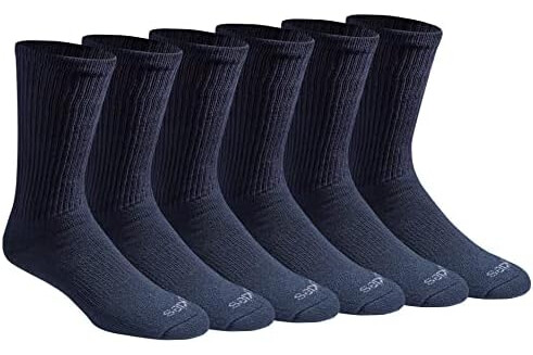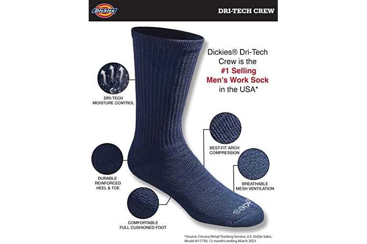 Dickies dri-tech comfort 6 Pairs crew with wicking, moisture management fibers keeps feet dry, ventilation channels engineered for air circulation and moisture control, arch compression hugs feet and keeps socks in place, while providing in-step support, Reciprocated heel and toe for superior fit and full cushion comfort