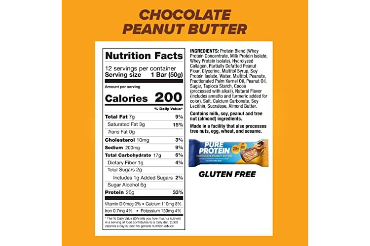 DELICIOUS HIGH PROTEIN BAR: Pure Protein Chocolate Peanut Butter Bars are full of flavor and contain 20g of protein for lasting energy. Each delicious bar is gluten free with high-quality protein that helps build lean muscle and strength.