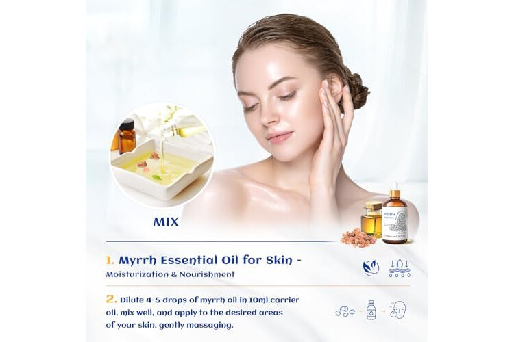 Skin Care: Add 4 drops of myrrh essential oil to 50ml of toner/cream/lotion, mix well and apply to face every morning and evening to improve dry skin and relieve skin problems