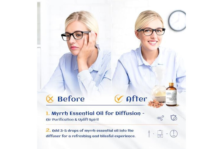 Multiple Use Scenarios: Add 3-4 drops of myrrh essential oil to the diffuser to help create a calming and relaxing atmosphere for yoga, meditation, reading, massage, aromatherapy, saunas, spas, bedrooms, living rooms,...