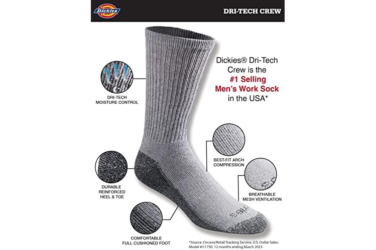 Dickies dri-tech comfort 6 Pairs crew with wicking, moisture management fibers keeps feet dry, ventilation channels engineered for air circulation and moisture control, arch compression hugs feet and keeps socks in place, while providing in-step support, Reciprocated heel and toe for superior fit and full cushion comfort