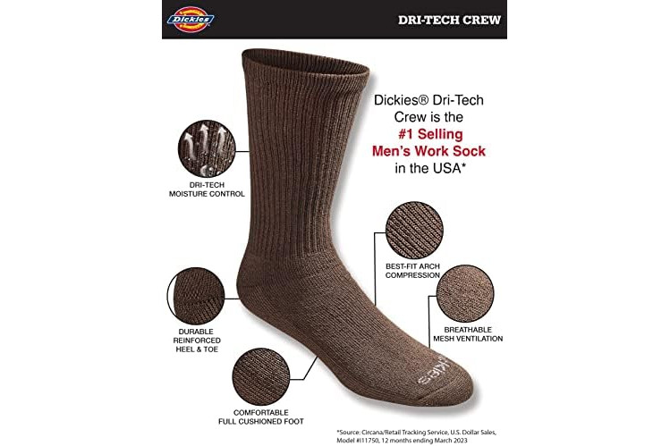 Dickies dri-tech comfort 6 Pairs crew with wicking, moisture management fibers keeps feet dry, ventilation channels engineered for air circulation and moisture control, arch compression hugs feet and keeps socks in place, while providing in-step support, Reciprocated heel and toe for superior fit and full cushion comfort