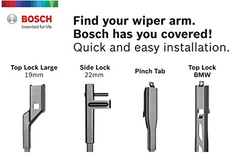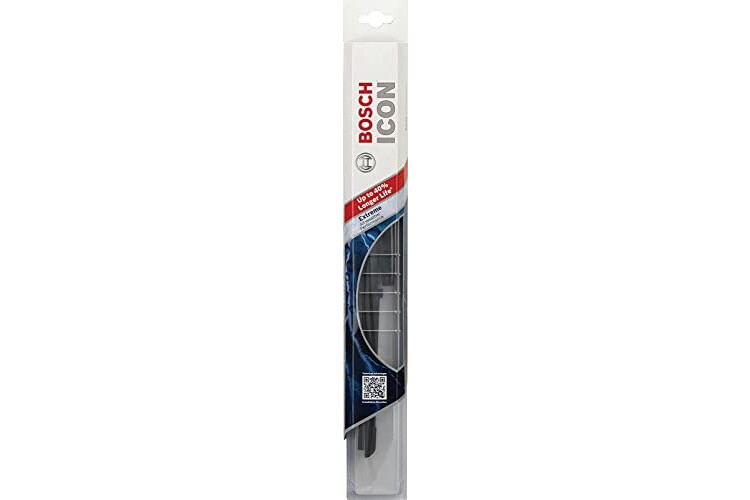 Bosch ICON wiper blades, featuring ClearMax 365 rubber technology and exclusive DynamicFit tension spring arcing, are optimized for extreme all-weather performance you can count on year-round. ClearMax 365 technology combines a soft rubber core with a powder-coated shell that protects the wiping edge from debris and harsh weather for longer life, reduces wiping friction for quieter performance, and ensures streak free visibility. DynamicFit technology, Bosch's exclusive tension spring arcing technology, adapts to the entire curve of the windshield and works with a built-in asymmetrical spoiler to maintain consistent blade contact on the windshield for superior wiping performance at all speeds. The patented beam design optimizes visibility even under extreme weather conditions, enabling better down road visibility for enhanced hazard detection, all while offering up to 40% longer life than other premium blades. Quick and easy installation with original equipment quality hook adapters that are compatible with side lock, pinch tab, or top lock wiper arms (not compatible with hook style wiper arms which require "A" or "B" suffix part numbers).