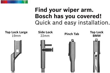 Bosch ICON wiper blades, featuring ClearMax 365 rubber technology and exclusive DynamicFit tension spring arcing, are optimized for extreme all-weather performance you can count on year-round. ClearMax 365 technology combines a soft rubber core with a powder-coated shell that protects the wiping edge from debris and harsh weather for longer life, reduces wiping friction for quieter performance, and ensures streak free visibility. DynamicFit technology, Bosch's exclusive tension spring arcing technology, adapts to the entire curve of the windshield and works with a built-in asymmetrical spoiler to maintain consistent blade contact on the windshield for superior wiping performance at all speeds. The patented beam design optimizes visibility even under extreme weather conditions, enabling better down road visibility for enhanced hazard detection, all while offering up to 40% longer life than other premium blades. Quick and easy installation with original equipment quality hook adapters that are compatible with side lock, pinch tab, or top lock wiper arms (not compatible with hook style wiper arms which require "A" or "B" suffix part numbers).