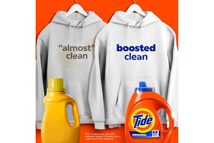 TOUGH ON STAINS: Tide’s laundry soap works on 100% of common stains plus has 10X the grease fighting ingredients versus leading bargain detergent. Don't settle for "almost clean", get Boosted clean with Tide laundry detergent, every load, every time