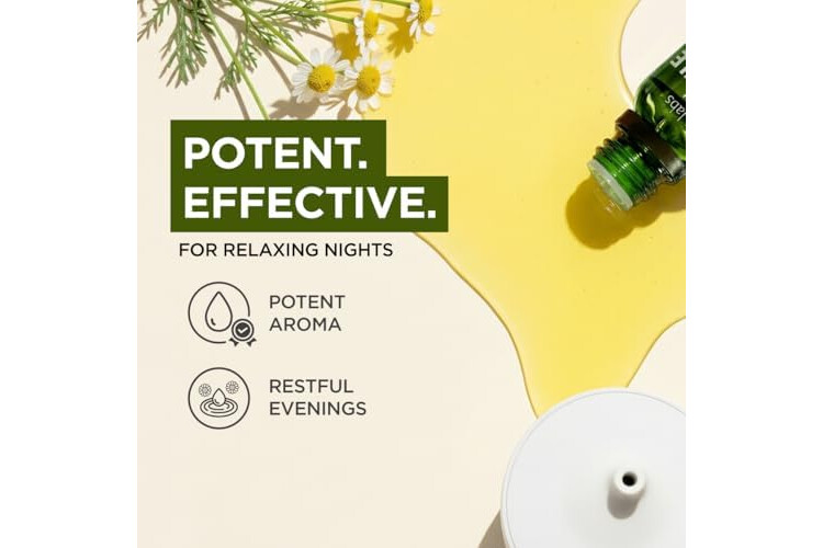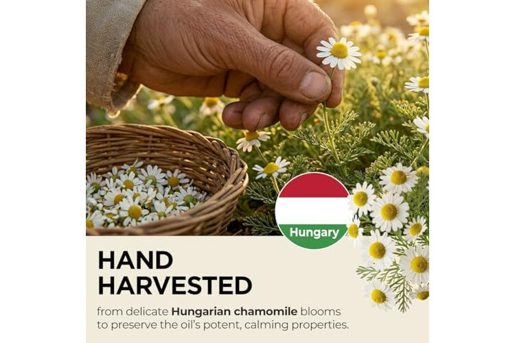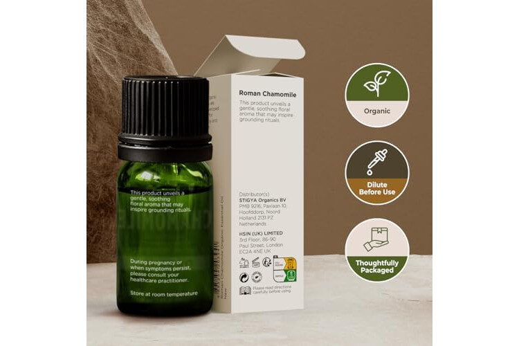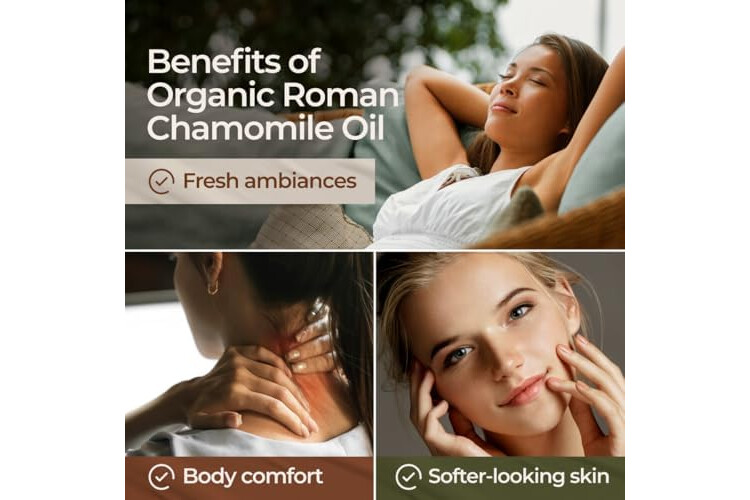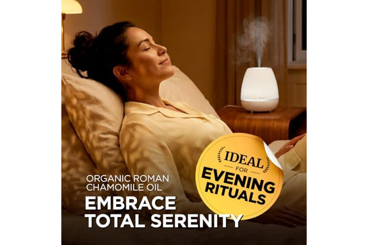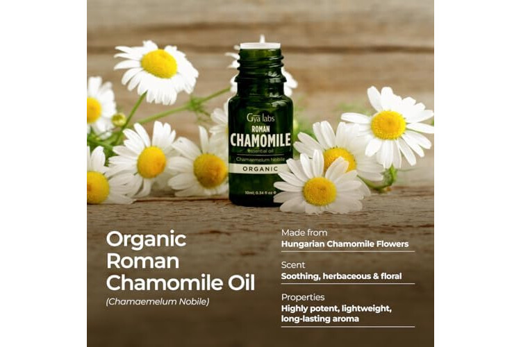 Creates a tranquil ambiance. Roman chamomile essential oil is appreciated in aromatherapy for its soothing aroma. Diffuse 1-2 drops of chamomile essential oil organic in a diffuser for 30 minutes before bed to cultivate a serene environment.