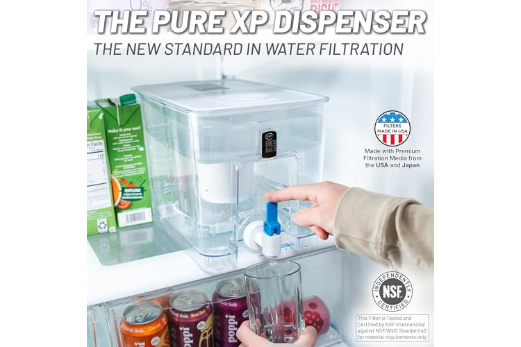 Filtered Dispenser for Refrigerator: This large water filtration dispenser for refrigerator is easy to pour and refill. This space efficient dispenser fits perfectly on refrigerator shelves and is great for families. This solid carbon block water purifier pitcher with filter will keep your family drinking filtered water for years to come. Rigorously tested against NSF/ANSI standards 42, 53, 401, and P473 (NSF 53 Water Filter) | Countertop water filter dispenser includes 1 filter