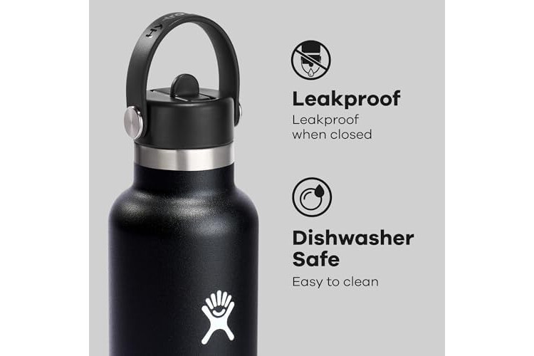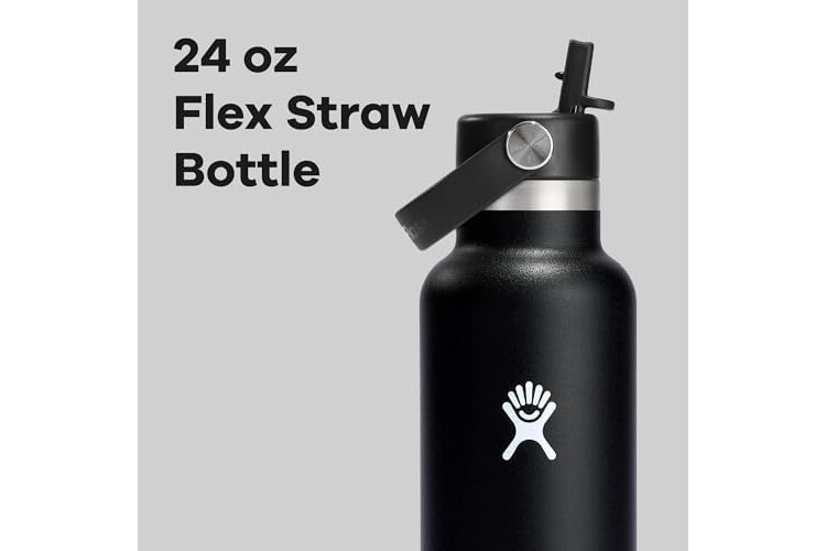 24 OZ BLACK STRAW BOTTLE: A 24 oz Standard Mouth water bottle with small drinking spout with Hydro Flask's leakproof Flex Straw Cap—easy to fill, easy to drink. Open it up, add your ice, and flip to sip. The insulated stainless steel keeps it cold for up to 24 hours.