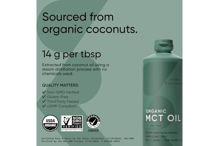 KETO, ORGANIC, & VEGAN: Sports Research supplements are formulated with quality in mind. Our organic MCT oil is steam distilled without chemicals, certified USDA Organic, as well as Informed Choice quality tested, Non-GMO Project verified, gluten-free and dairy-free