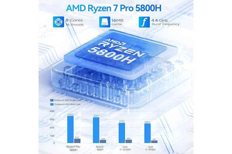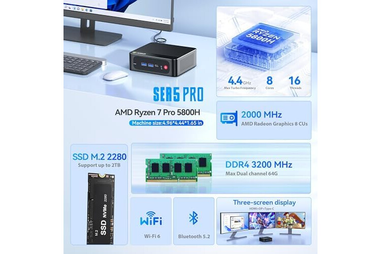【Powerful CPU AMD Ryzen 7 5800H】Beelink SER5 Pro Mini PC powered with AMD Ryzen 7 5800H(8Core 16 Threads, Up to 4.5GHz, L2 4MB L3 16MB Cache), built-in AMD Radeon 8 Cores Graphics 2000 MHz. It handles heavy computing tasks smoothly, multitasks better, and provides you with excellent performance. Which can be widely used for office(PPT, AI, PS, PR) and home(video, music and web content)