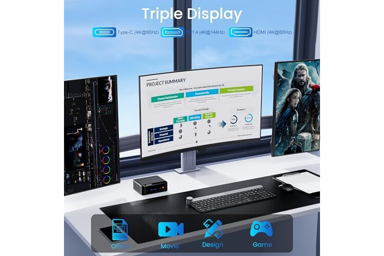 【24GB RAM 500GB NVMe SSD】The Mini computer is equipped with 24GB SO-DIMM LPDDR5, 500GB M.2 SSD NVMe 2280(upgradeable to max 8TB) for faster command processing. Dual channel LPDDR5 upgradeable to max 32GB(2 x 12GB, up to 3200MHz). The mini pc can support powerful loading and processing capabilities for a smoother experience, such as browsing through multiple memory-hungry tabs and opening a huge graphic file quickly and easily