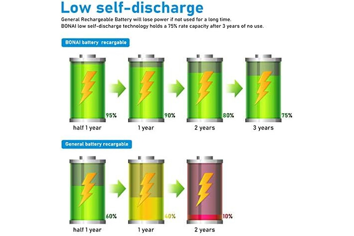 Low Self-discharge: It will still maintain 80% of initial capacity after 3 years of non-use, it’s highly recommended to be fully charged every 3 months