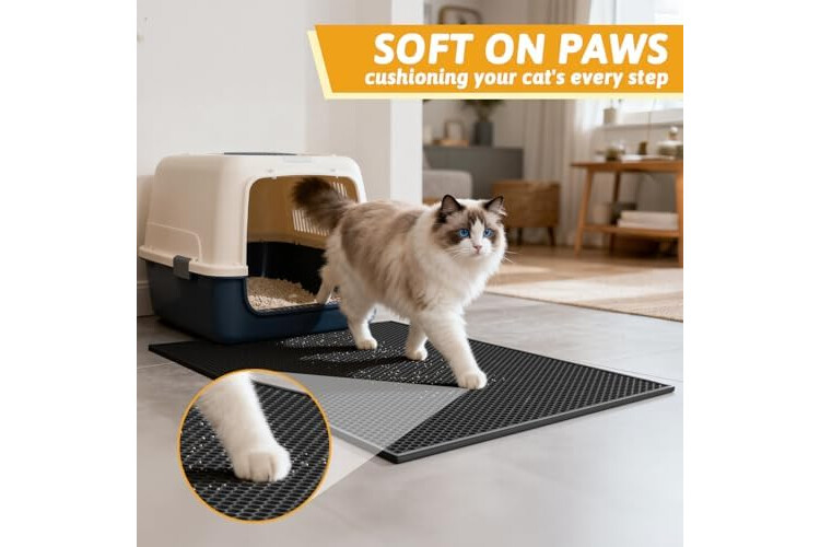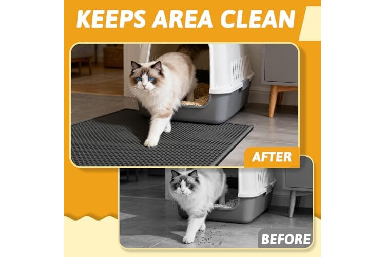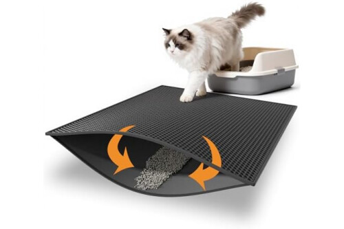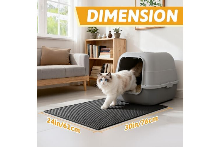 Anti Tracking EZ Open Edge Litter Mat: Double-layer honeycomb design helps you gather the litter. You just pick up the mat and all the litter falls through and then dump it back in the litter box make it recycling. No more getting litter stuck to my feet on a daily basis! Large holes is large enough to catch and trap litter. Suitable for lots of type of litter, and kitty litter boxes,hooded,self cleaning litter box.