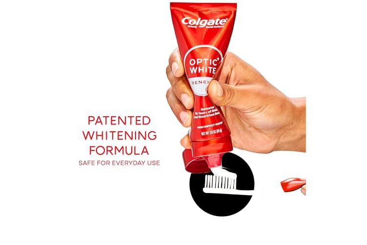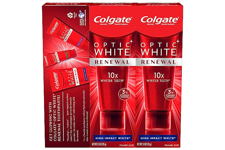 • Three 3 oz. tubes of Colgate Optic White Renewal Whitening Toothpaste, High Impact White