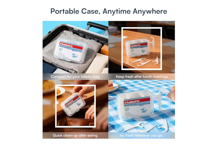 【WHITE UNFLAVORED FLOSSERS WITH TRAVEL CASE】: FAMILIFE flosser use travel cases for more convenient. Easy for you to travel and outgoing; You can take them to your office, your car, your backpack and so on. 4-Count dental floss cases help you have a fresh, clean mouth anywhere and anytime