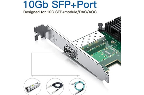 SFP+ PCI-E NIC: 10Gb Single SFP+ Port supports 10G SFP+ module/ DAC /AOC Cable, offer a dramatic 10x speed increase over standard Gigabit adapters, speeds up to 10 Gbps; PCI Express 2.0. 5.0 G T/s X8 Lane, compatible with PCIE X8, X16 Slot