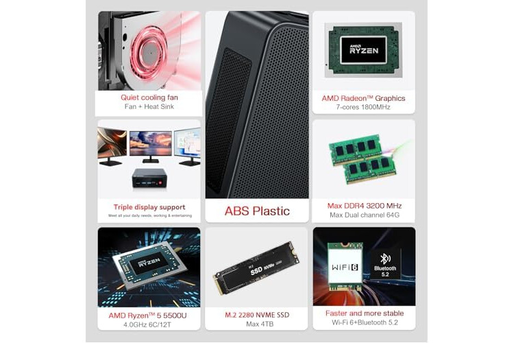 ◆New 5000 Series of CPU - Mini PC powered with AMD Ryzen 5 5500U 6-Core/12-Thread(3.2GHz up to 4.0GHz, L2 4MB L3 16MB Cache). Which can turn your desk into a powerful workstation just by adding a keyboard and mouse. WiFi 6(802.11ax) and Bluetooth 5.2 is faster and more stable data transmission and there is no network congestion. More wireless support, say goodbye to cluttered desktop.