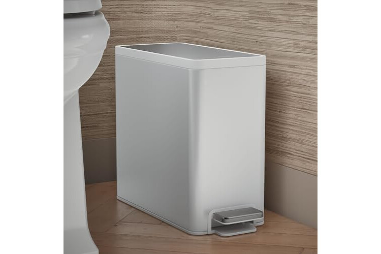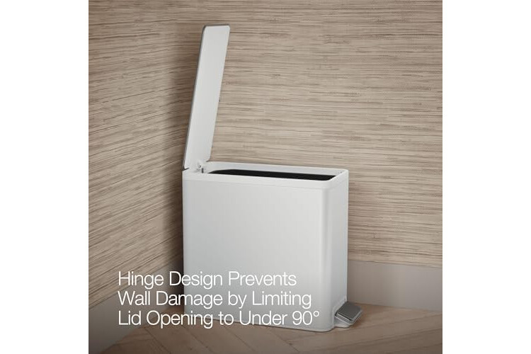 Sleek Space Saving Design: Efficient footprint with clean lines and flush features allows the bathroom trash can to be placed against the wall and interior hinge design protects from scuffs and scratches