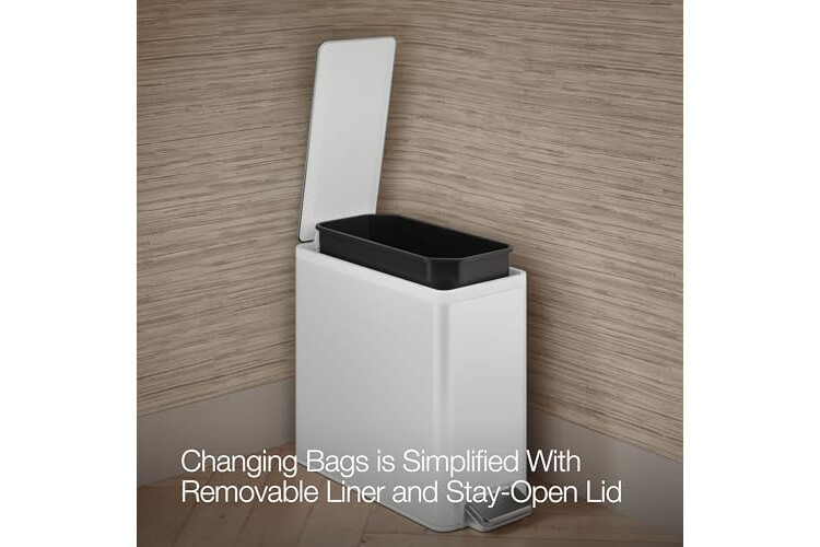 Hands Free and Fingerprint Proof: Hands-free operation with durable metal foot pedal and fingerprint-resistant white stainless steel finish leads to your garbage bin staying cleaner longer
