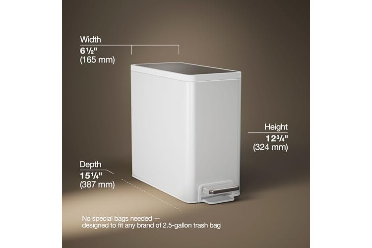 Kohler 20957-STW 2.5 Gallon Slim Step Trash Can, Bathroom Trash Can with Soft-Close Foot Pedal, White with Stainless Steel