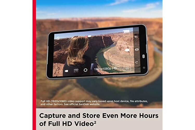 Up to 64GB to store even more hours of Full HD video (1GB=1,000,000,000 bytes. Actual user storage less. Full HD (1920x1080) video support may vary based upon host device, file attributes, and other factors. See official SanDisk website.)