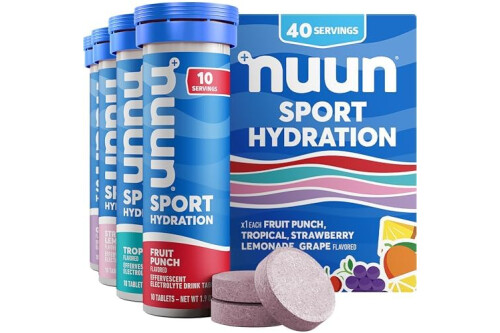 4 REFRESHING FLAVORS: This 4 pack contains one tube (10 tablets each) each of popular Nuun flavors Fruit Punch, Tropical, Strawberry Lemonade, and Grape for a total of 40 servings