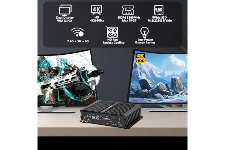 RAM & SSD of the Fanless Mini PC: Pre-installed 16GB DDR4 3200MHz RAM, 512GB NVMe SSD.