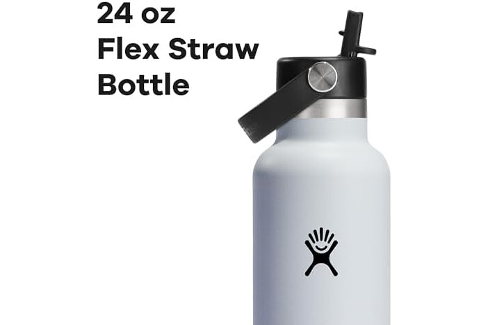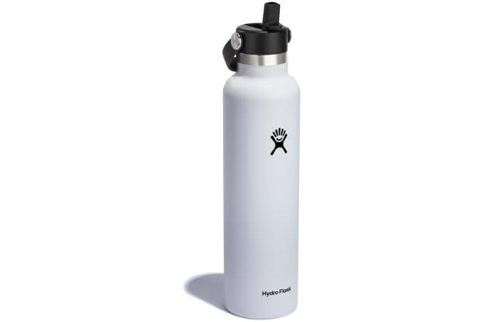 24 OZ WHITE STRAW BOTTLE: A 24 oz Standard Mouth water bottle with small drinking spout with Hydro Flask's leakproof Flex Straw Cap—easy to fill, easy to drink. Open it up, add your ice, and flip to sip. The insulated stainless steel keeps it cold for up to 24 hours.