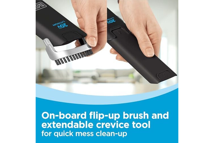 • Built-in accessories - flip-up brush and extendable crevice tool for everyday messes
