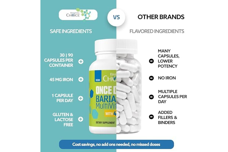 MULTIVITAMIN AND MINERAL EXPLOSION: Bariatric Choice ONCE DAILY Bariatric Multivitamin Capsule delivers 22 nutrients, 14 of those are 200% RDA or more, including 45mg of Iron.