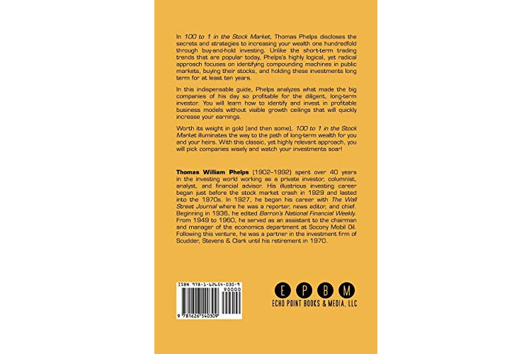 In 100 to 1 in the Stock Market, Thomas Phelps discloses the secrets and strategies to increasing your wealth one hundredfold through buy-and-hold investing. Unlike the short-term trading trends that are popular today, Phelps's highly logical, yet radical approach focuses on identifying compounding machines in public markets, buying their stocks, and holding these investments long term for at least ten years.